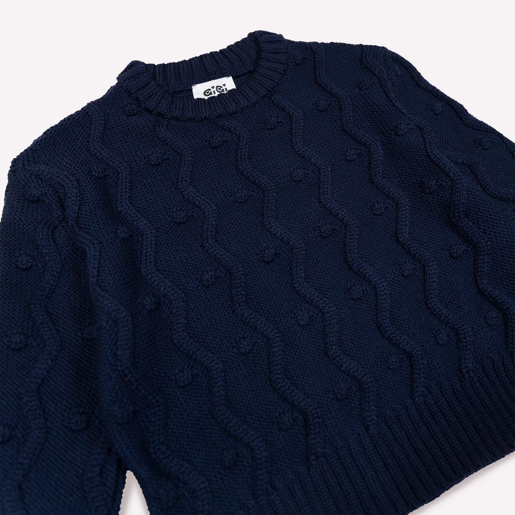 Adding a dose of playful tactility to our beloved GiGi shape, the Bubble Sweater is our newest edition, adorned with mini pom poms and zig-zags. We know what it’s like to have a favorite that you reach for time and time again, the go-to that never disappoints, and we are pretty sure this is it, with just the right artisanal touch. Knit in a soft Merino wool, this sweater is comfy, breathable, and relaxed with a drop shoulder and a slightly boxy fit. The solid navy lends a classic feel to any Fall look when paired back with skirts, jeans, or topping off dresses.