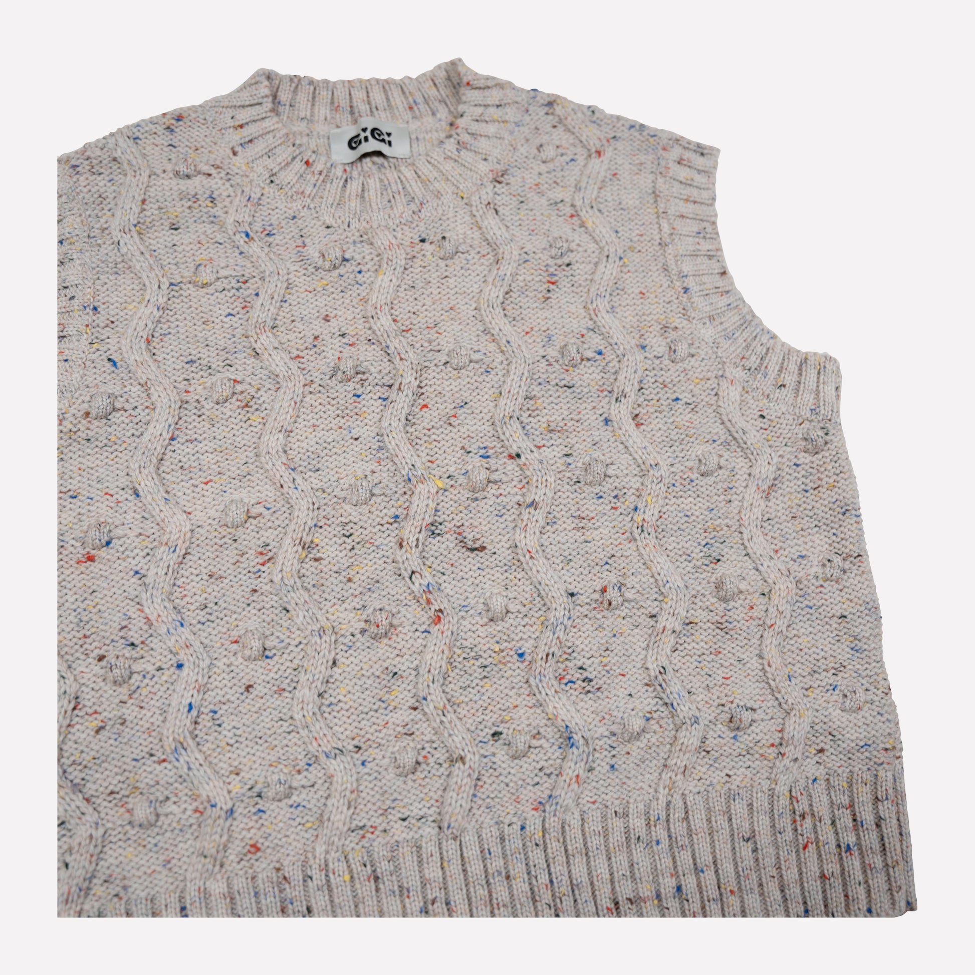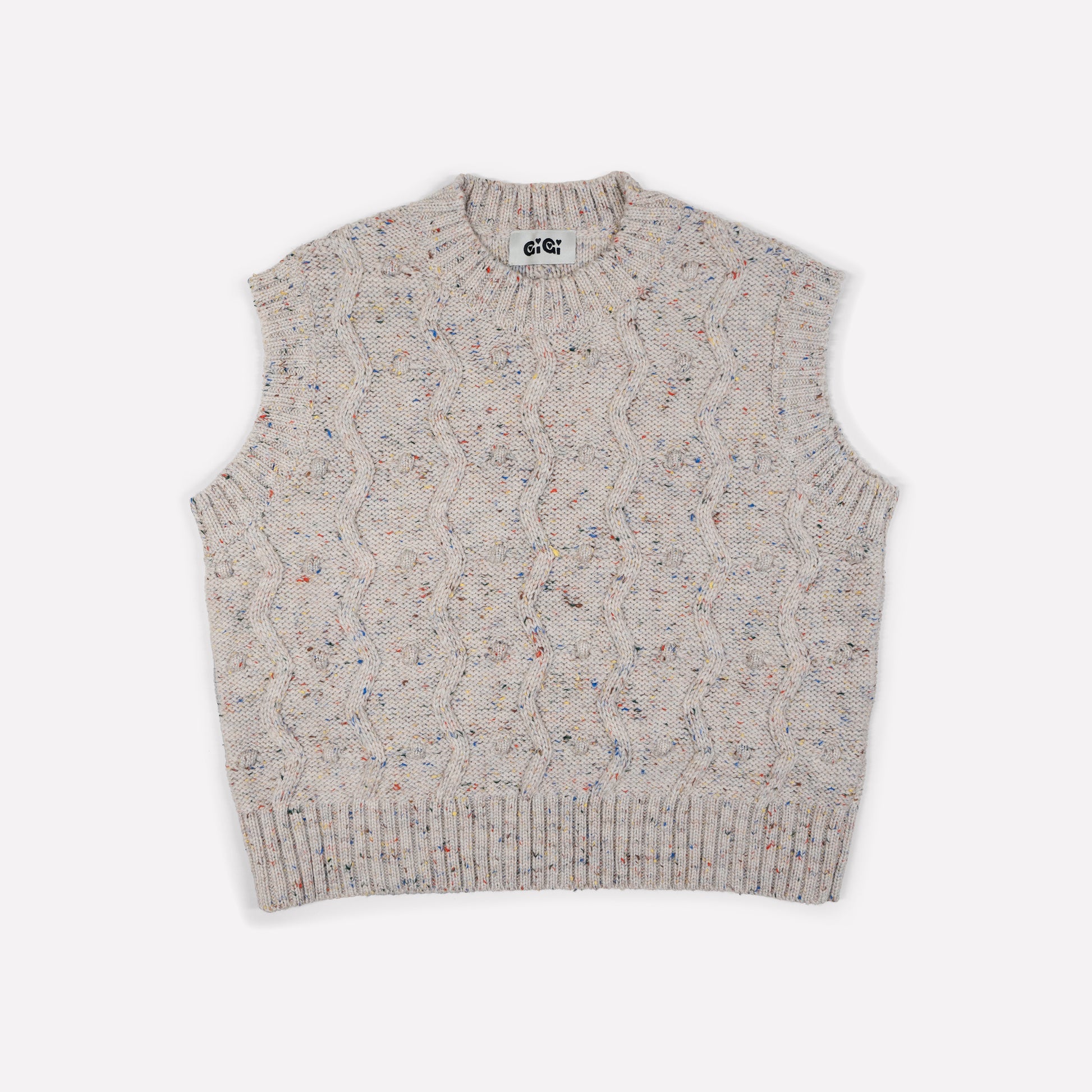 Matching the playful textures of our Cardigan by the same name, the Bubble Vest is embellished with zig-zags and mini pom-poms, lending a joyful tactility to this versatile shape. Making out as an ideal seasonal transition piece, don this sweater with underpinnings like tee shirts, turtlenecks, or even button-ups. It has that throw on kind of quality so you might also think to layer it over dresses and overalls, too. Crafted out of our soft Merino wool, this vest is both comfy and easy to wear, with a silhouette that is generous and slightly cropped.