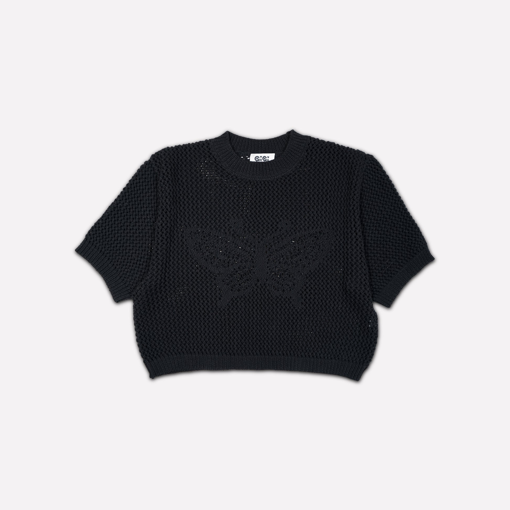 Our sweet Butterfly Cotton Knit T-shirt in Black features a crochet-like mesh butterfly design, made from 100% organic cotton. Perfect for layering or wearing solo, this breathable tee brings a playful, yet elegant touch to your warm-weather wardrobe.