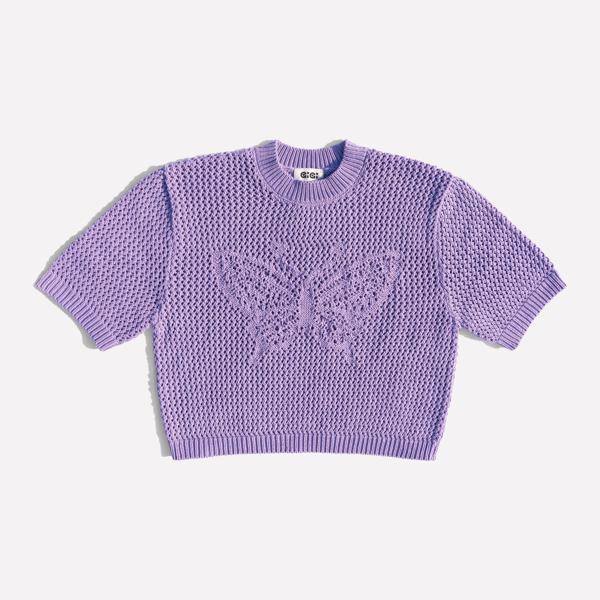 Our sweet Butterfly Cotton Knit T-shirt in Lavender features a crochet like mesh butterfly design, made from 100% organic cotton. Perfect for layering or wearing solo, this breathable tee brings a playful, yet elegant touch to your warm-weather wardrobe.