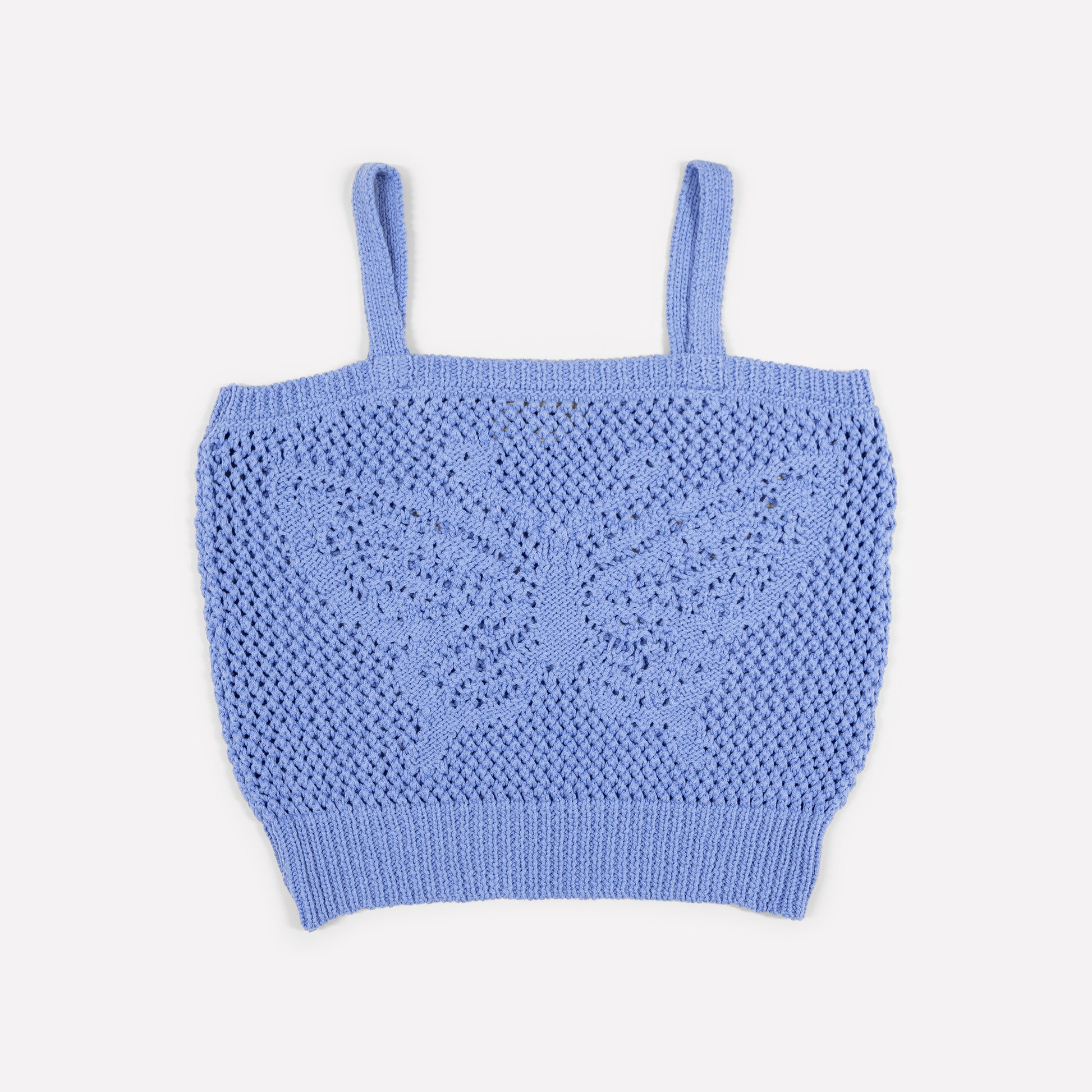 Delicate and airy, our Butterfly Cotton Knit Tank Top in Blue features a mesh knit design with a crochet-like butterfly pattern. Made from 100% organic cotton, this lightweight, breathable tank is the perfect layering piece for warmer days or a cute beach look. Its unique novelty design adds a playful touch to any outfit.