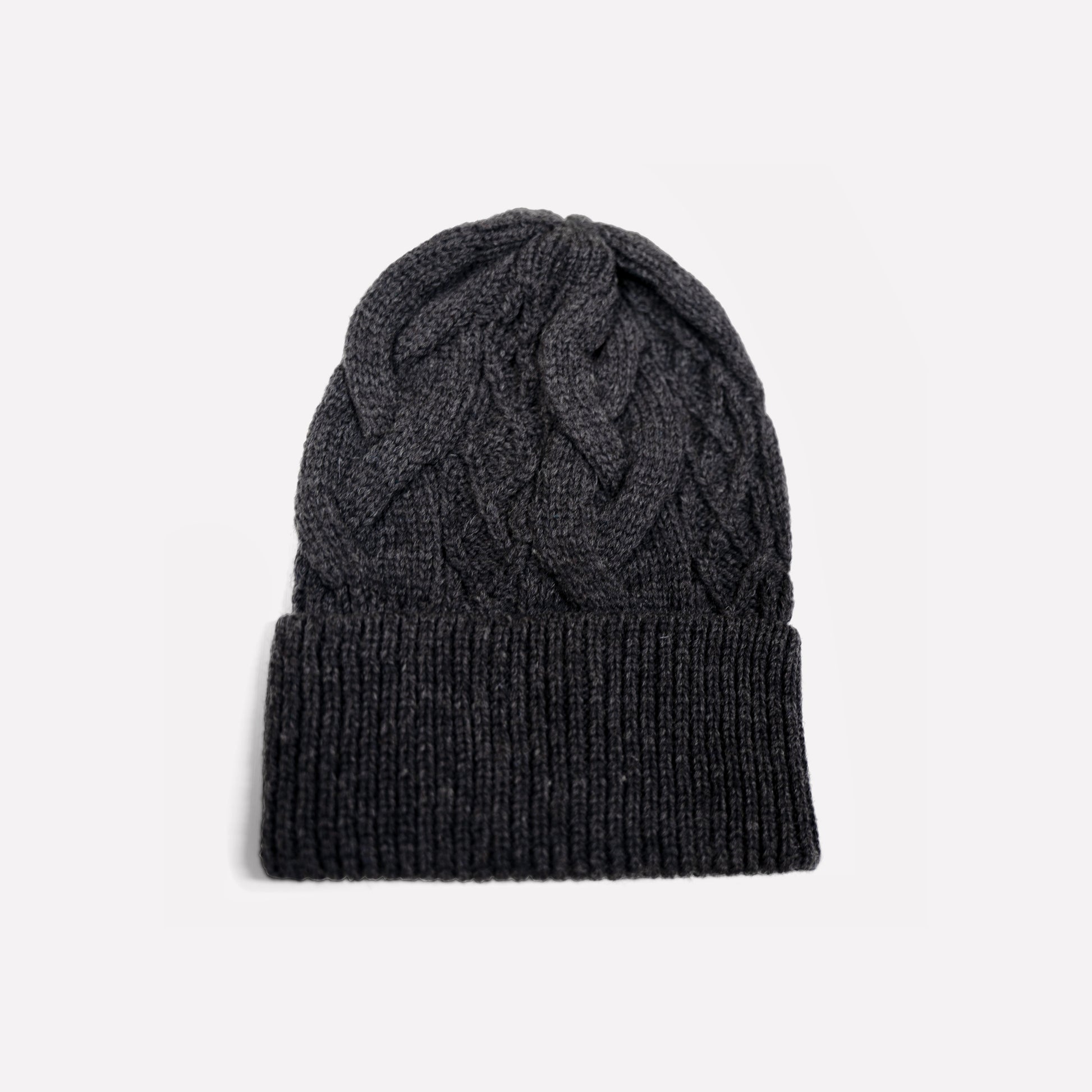 Our Cable Hat is knit in charcoal grey medium weight yarn.