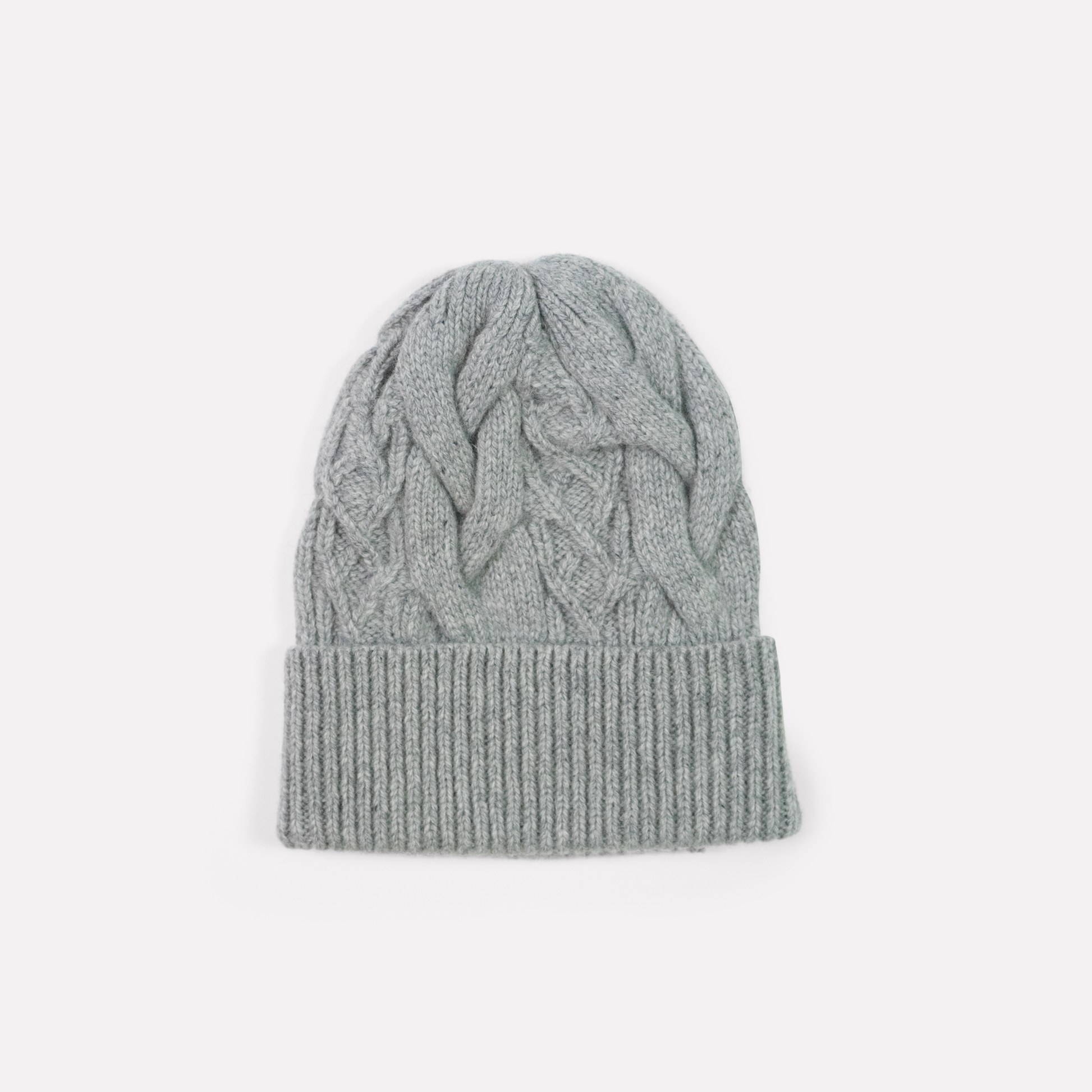 Our Cable Hat is knit in dove grey medium weight yarn. Warm and cozy with a slight slouch.