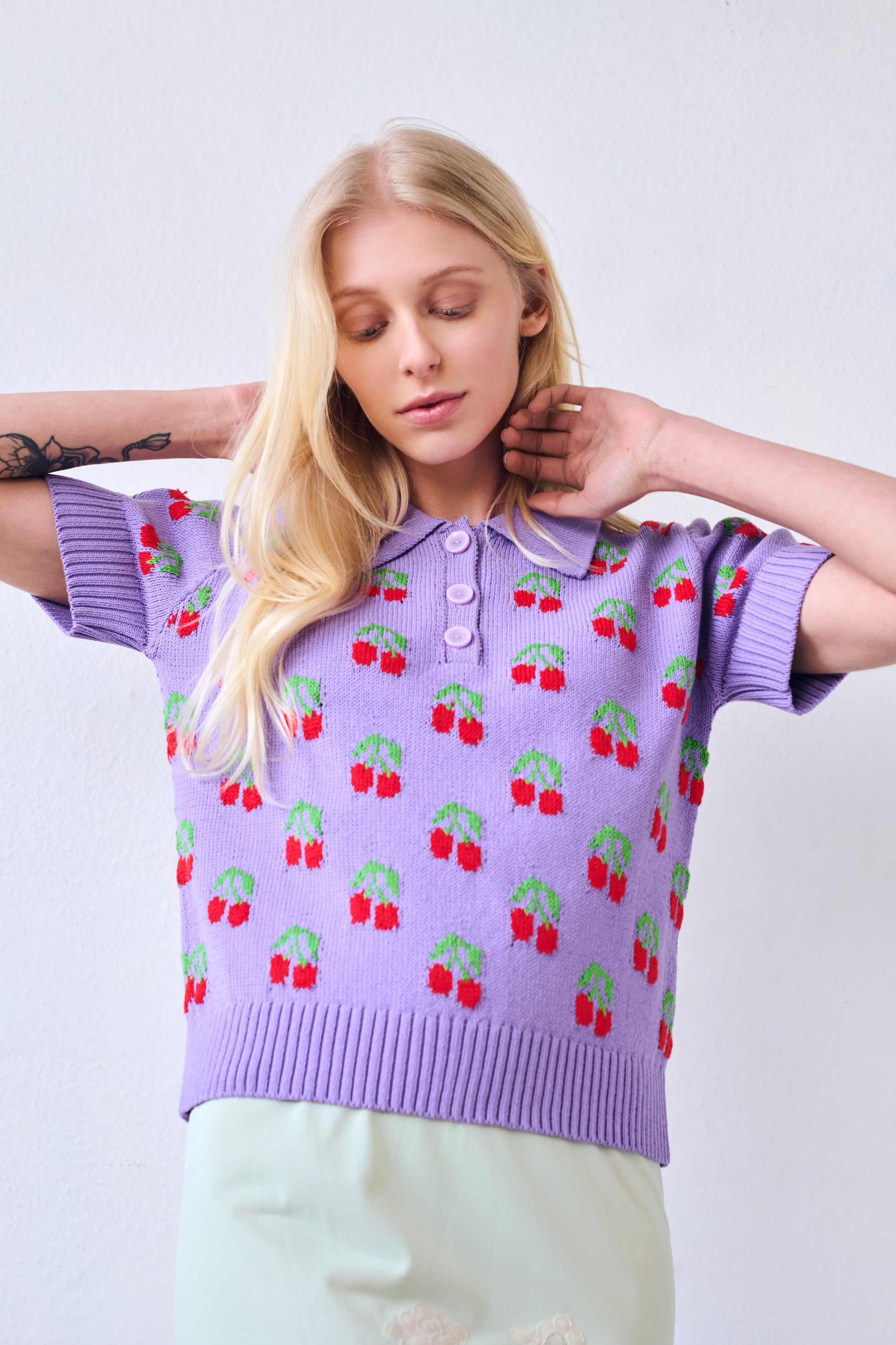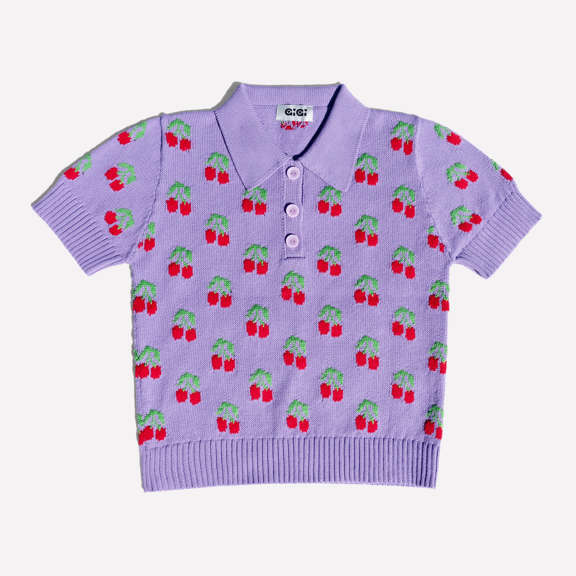 A light cotton polo in violet, dotted with red cherries and green leaves. Classic in silhouette, joyful and charming in spirit an easy piece made to brighten everyday moments.