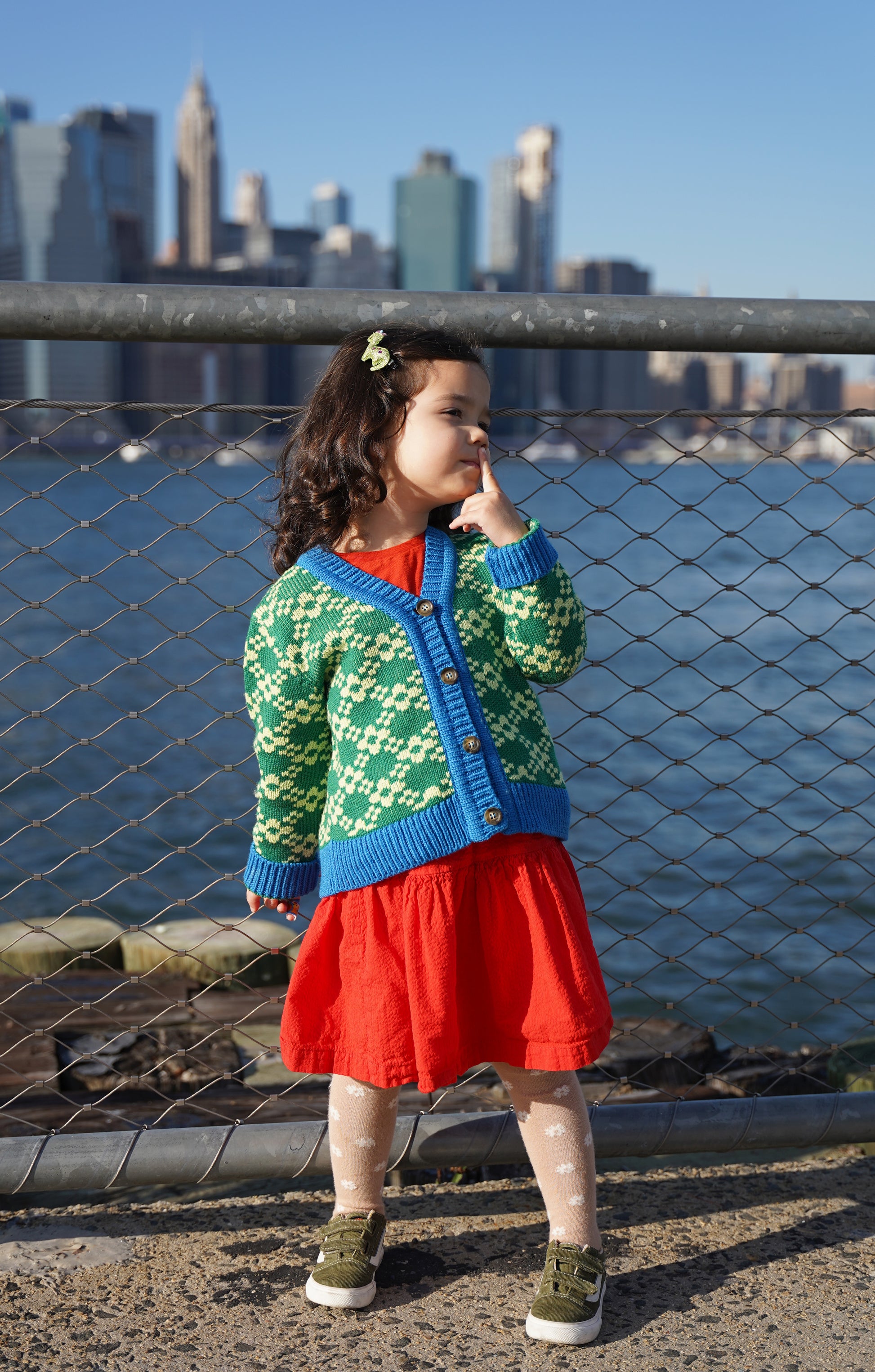 With our petite version of Flower Chain Cardi, we wanted to lighten the cold weather mood and we knit in some retro blooms to our signature cardigan shape. Rendered in a soft merino yarn that is comfy and breathable. This happy bright green and blue colorway touches on our penchant for vintage with just the right amount of pop.