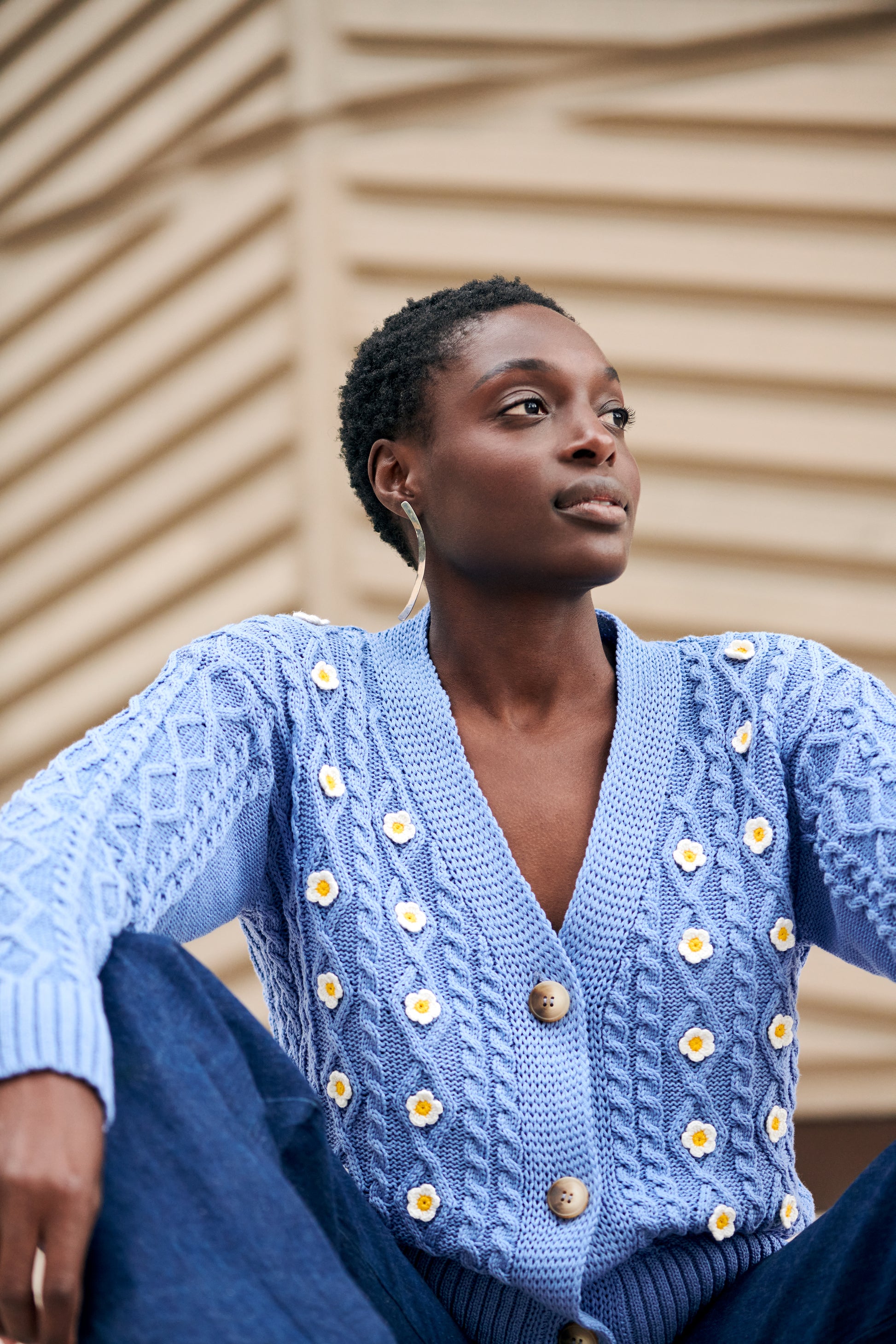 Our Daisy Cardigan draws inspiration from fields of wildflowers in the Bulgarian mountains where our sweaters are produced (and where our founder grew up spending her summers!). Adorable yellow and white hand crocheted daisy flowers highlight the skilled handwork of our artisans. Knit in a light blue summer weight cotton yarn and designed with alternating patterns of cables which add a playful textural interest. A line of three resin buttons down a front rib placket lend a touch of practical charm to this relaxed cardigan that would love to be layered over floral dresses or just jeans and a tee for spring. Also available in mustard and black.