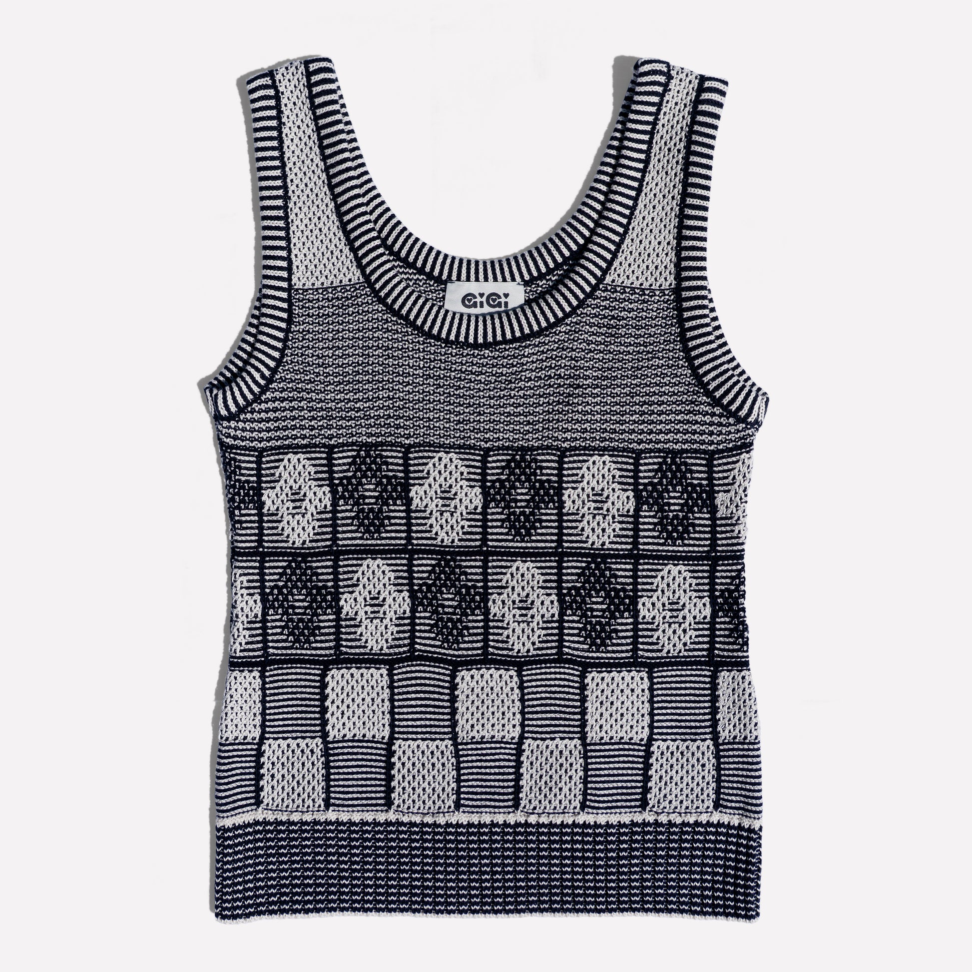 A cotton tank top in navy and ivory, knit with graphic jacquard flowers and checks. Designed with a clean, easy silhouette, it feels joyful, effortless, and ready for everyday sunshine.