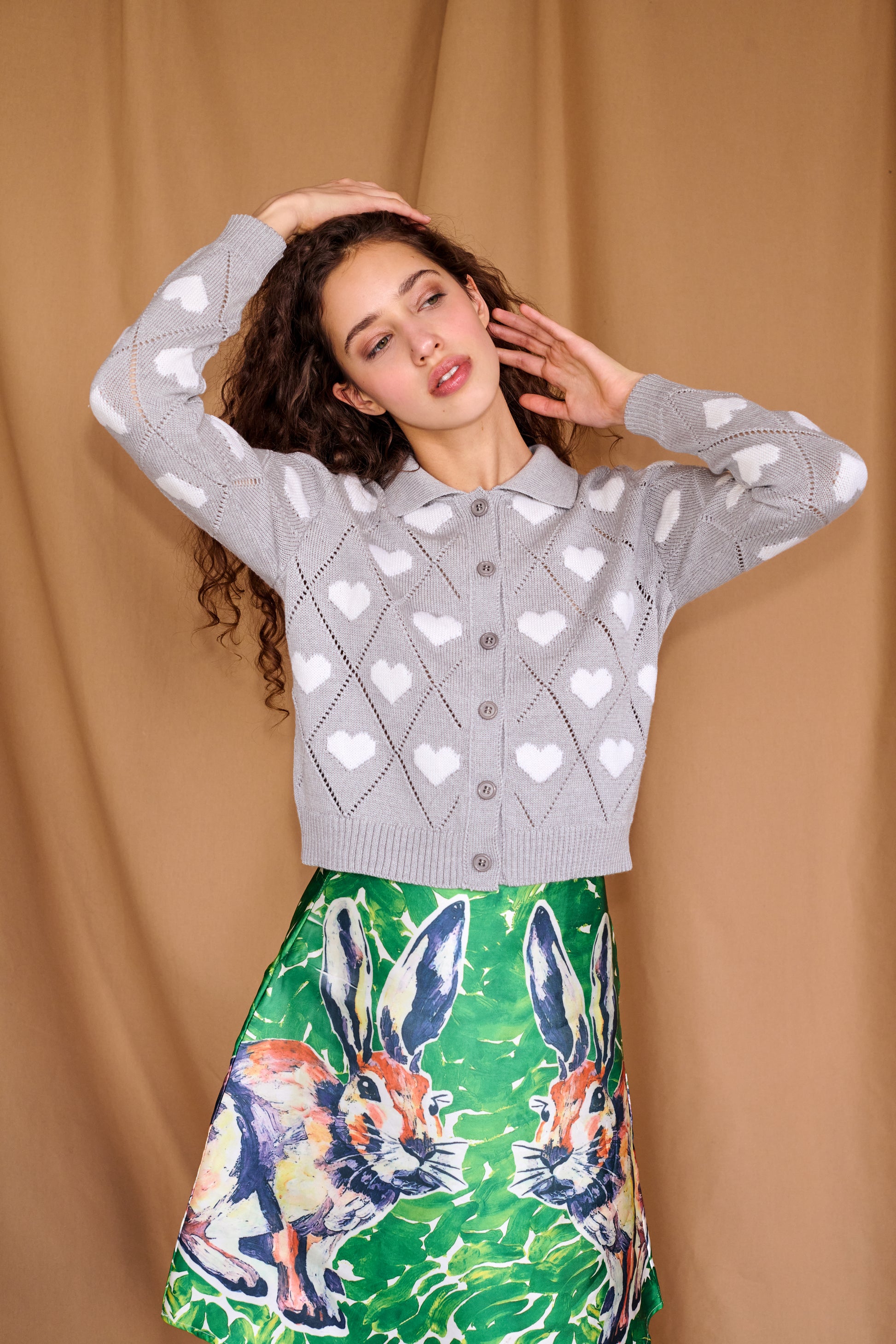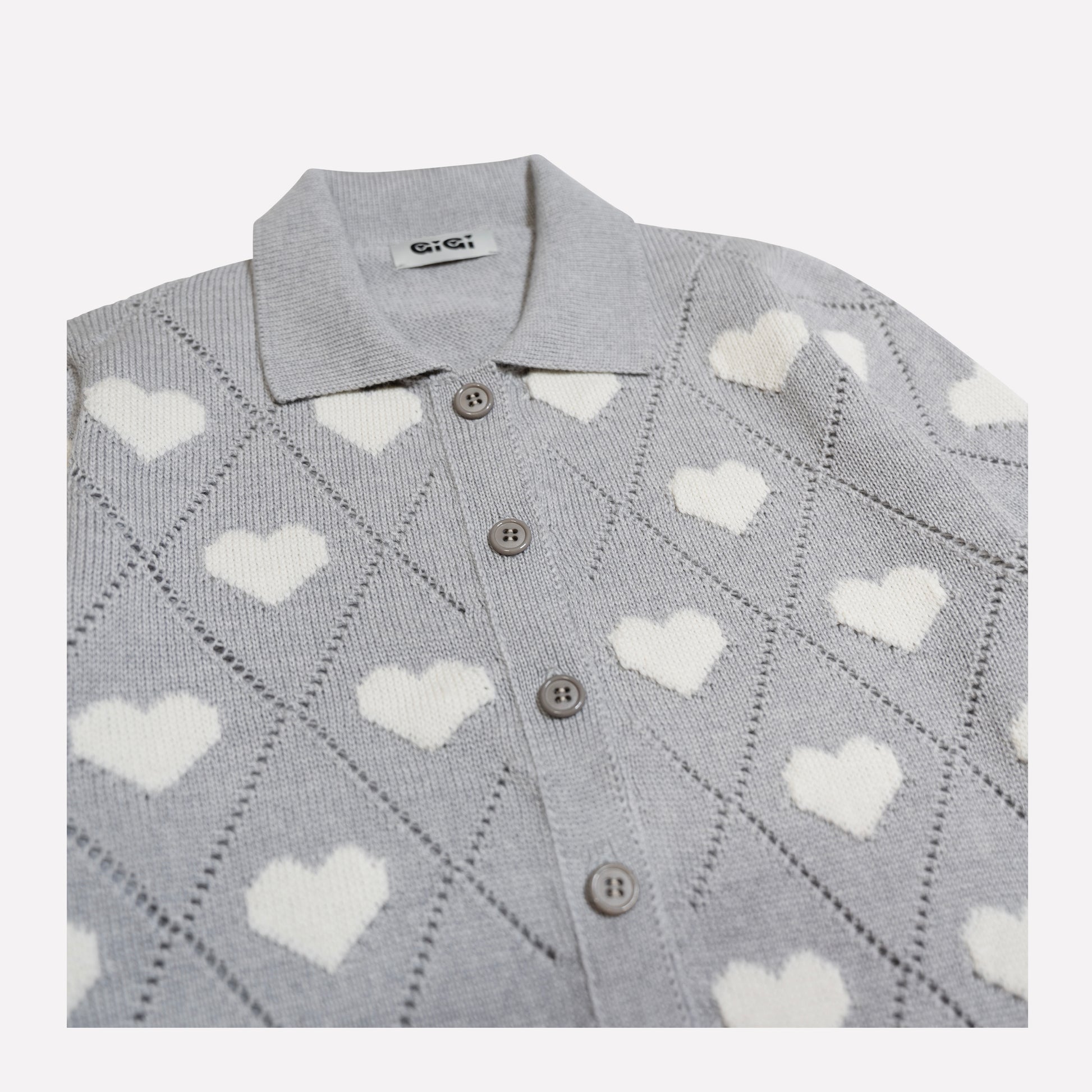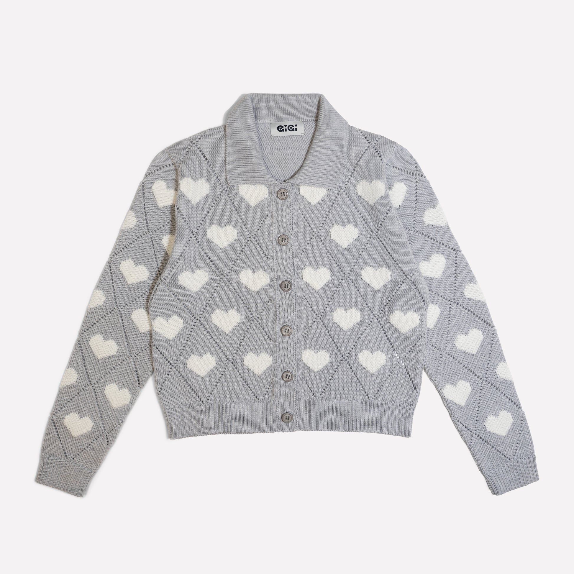 This soft lightweight cardigan is a twist on our bestselling Love Sweater — now with a classic polo collar. Knit in light grey with ivory intarsia hearts, each one is framed in a diamond of airy eyelet stitches, adding subtle texture and charm. The fit is slim silhouette, ideal for wearing on it's own.