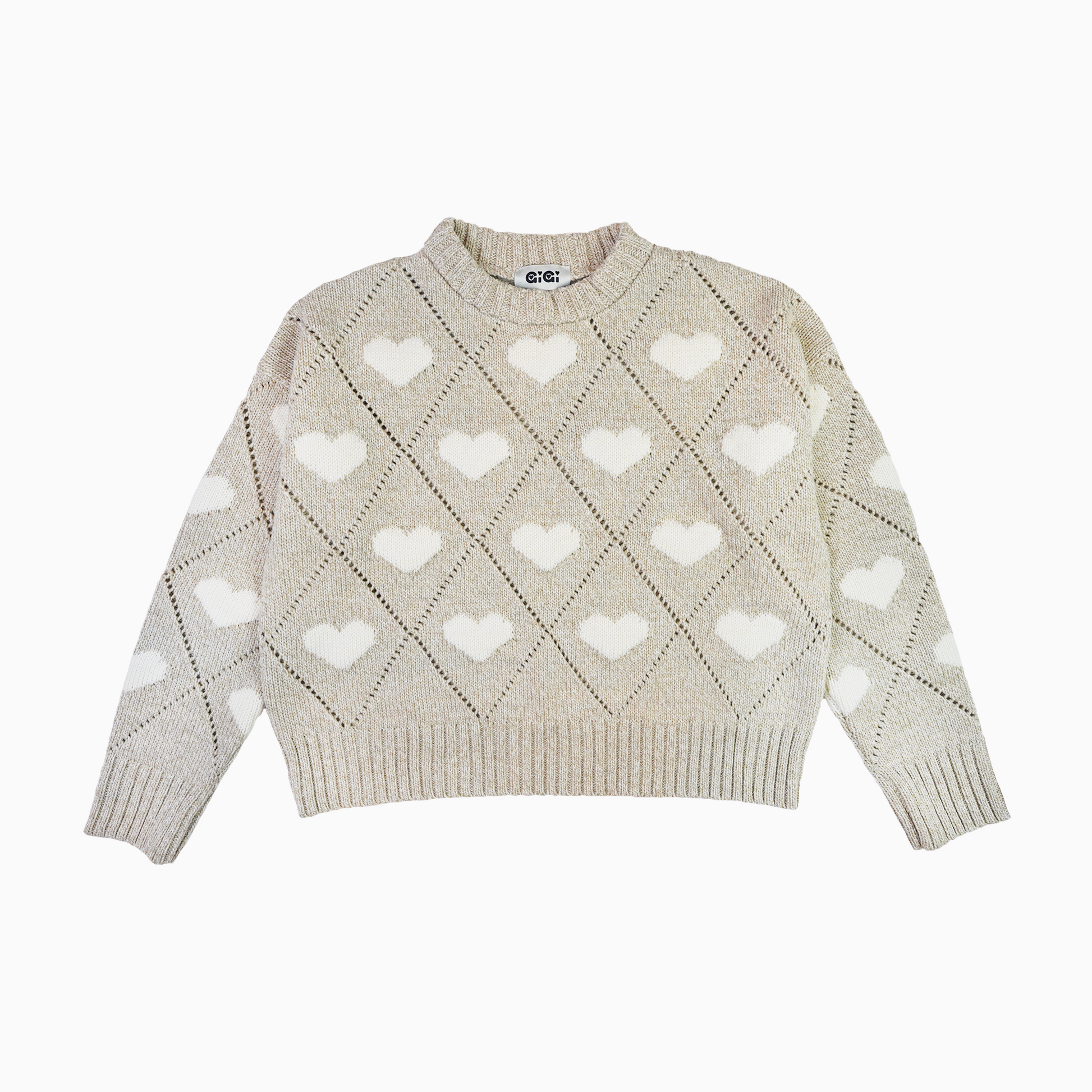 Playful and optimistic, our Love Sweater will make your day (and everyone else's'!) A beige marl sweater is certainly a must have, but adding hearts is what makes it GiGi. Each ivory intarsia heart is nestled in a diamond, shaped with knitted eyelets. Rendered in a soft and breathable medium weight knit, the Love Sweater is relaxed with a boxy and slightly cropped shape.