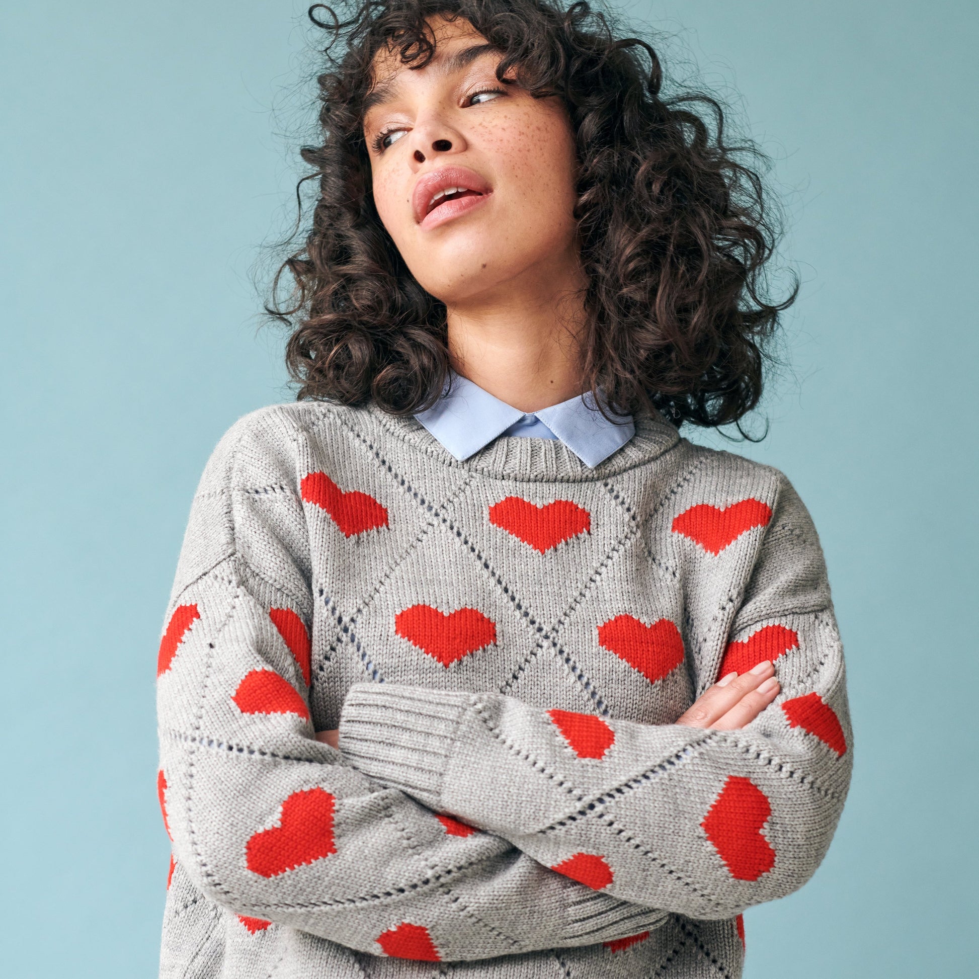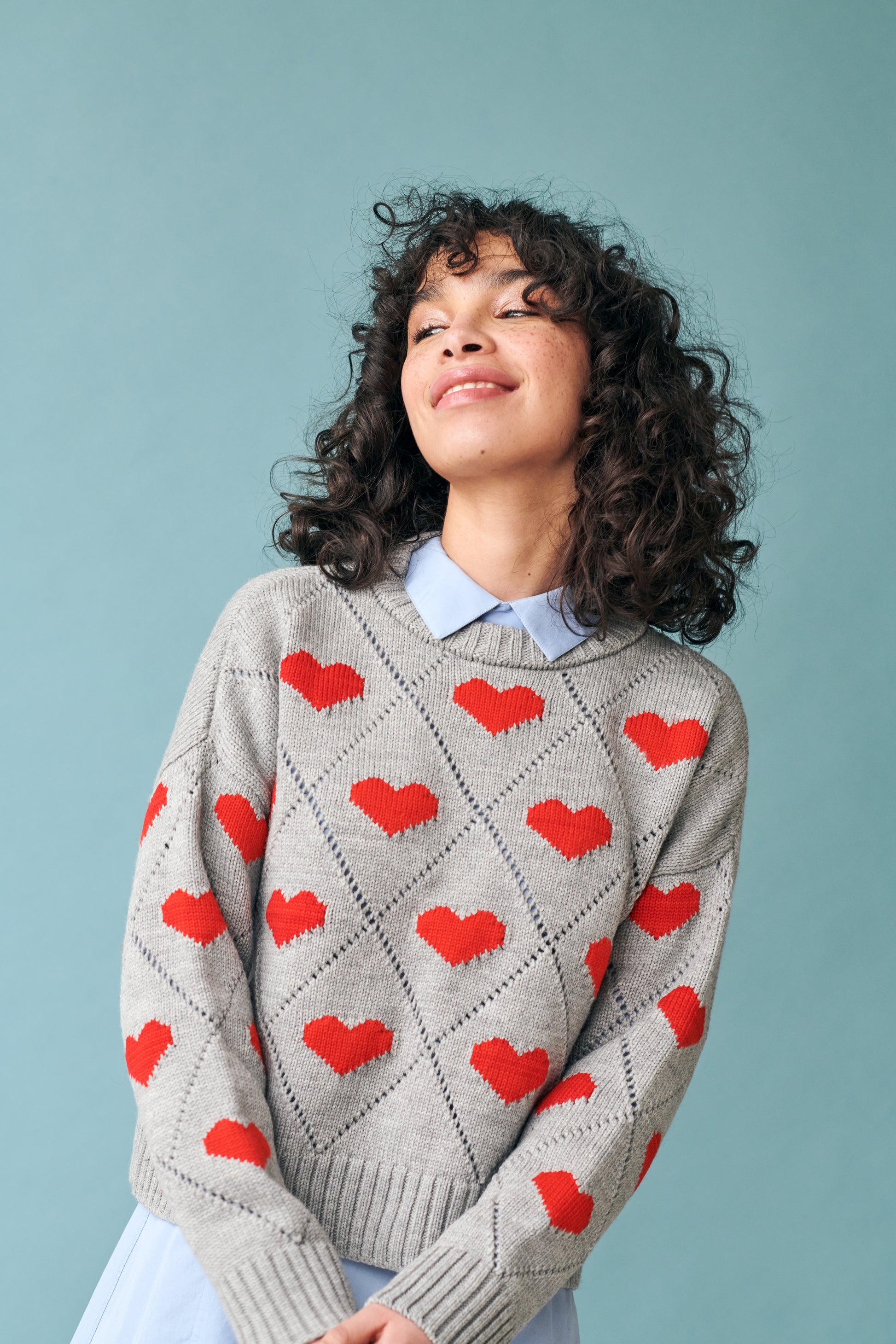 Playful and optimistic, our Love Sweater will make your day (and everyone else's'!) A grey sweater is certainly a must have, but adding hearts is what makes it GiGi. Each red intarsia heart is nestled in a diamond, shaped with knitted eyelets. Rendered in a soft and breathable medium weight knit, the Love Sweater is relaxed with a boxy and slightly cropped shape.