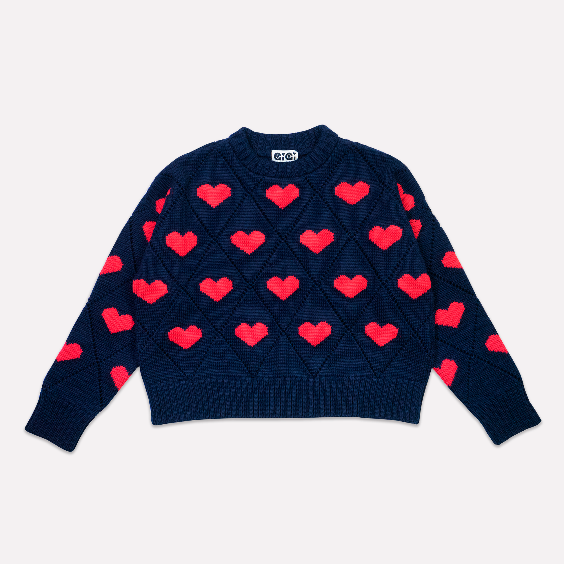 Playful and optimistic, our Love Sweater will make your day (and everyone else's'!) A navy sweater is an all round must have, but adding hearts is what makes it GiGi. Each red intarsia heart is nestled in a diamond, shaped with knitted eyelets. Rendered in a soft and breathable medium weight knit, the Love Sweater is relaxed with a boxy and slightly cropped shape.