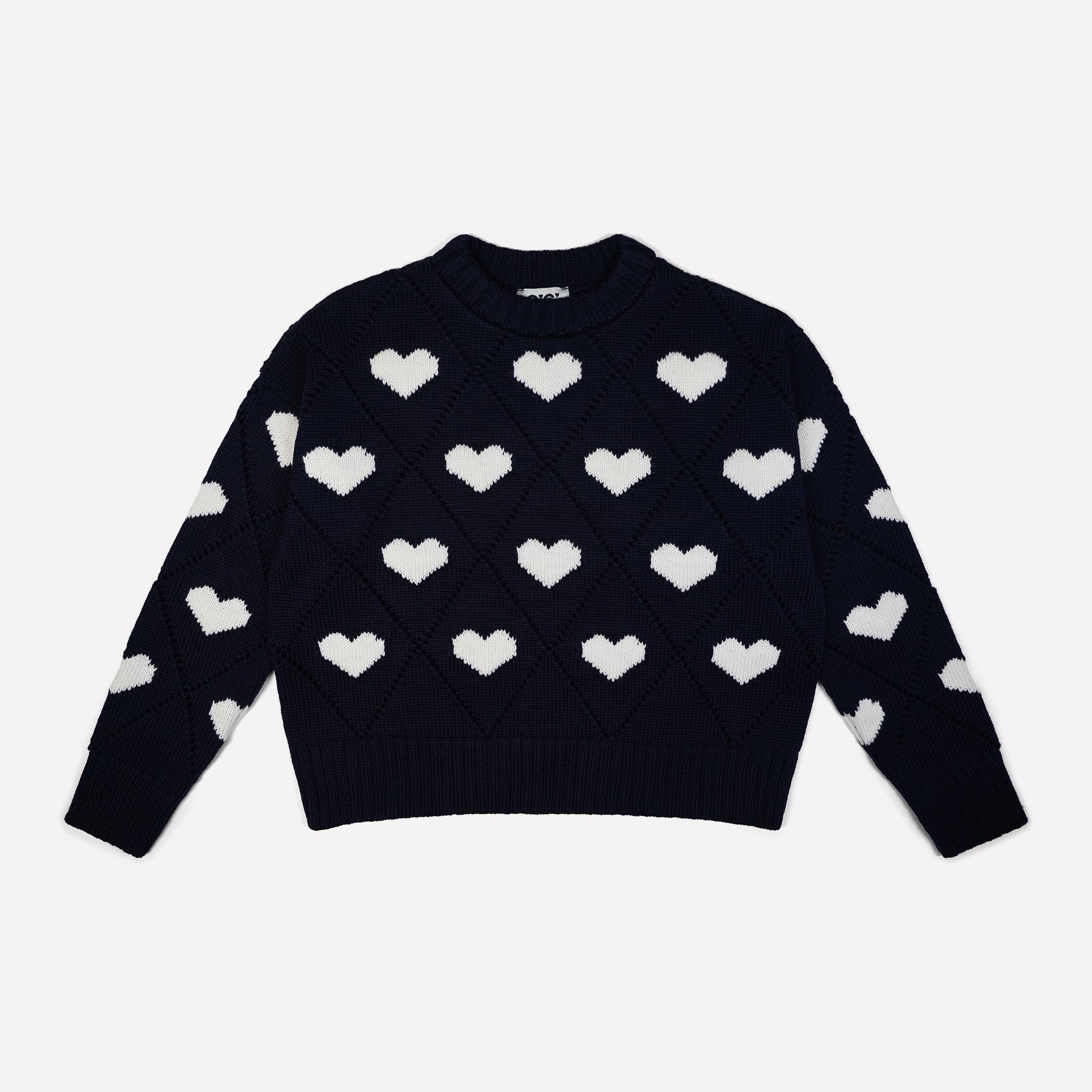 Playful and optimistic, our Love Sweater will make your day (and everyone else's'!) A navy sweater is certainly a must have, but adding hearts is what makes it GiGi. Each ivory intarsia heart is nestled in a diamond, shaped with knitted eyelets. Rendered in a soft and breathable medium weight knit, the Love Sweater is relaxed with a boxy and slightly cropped shape.