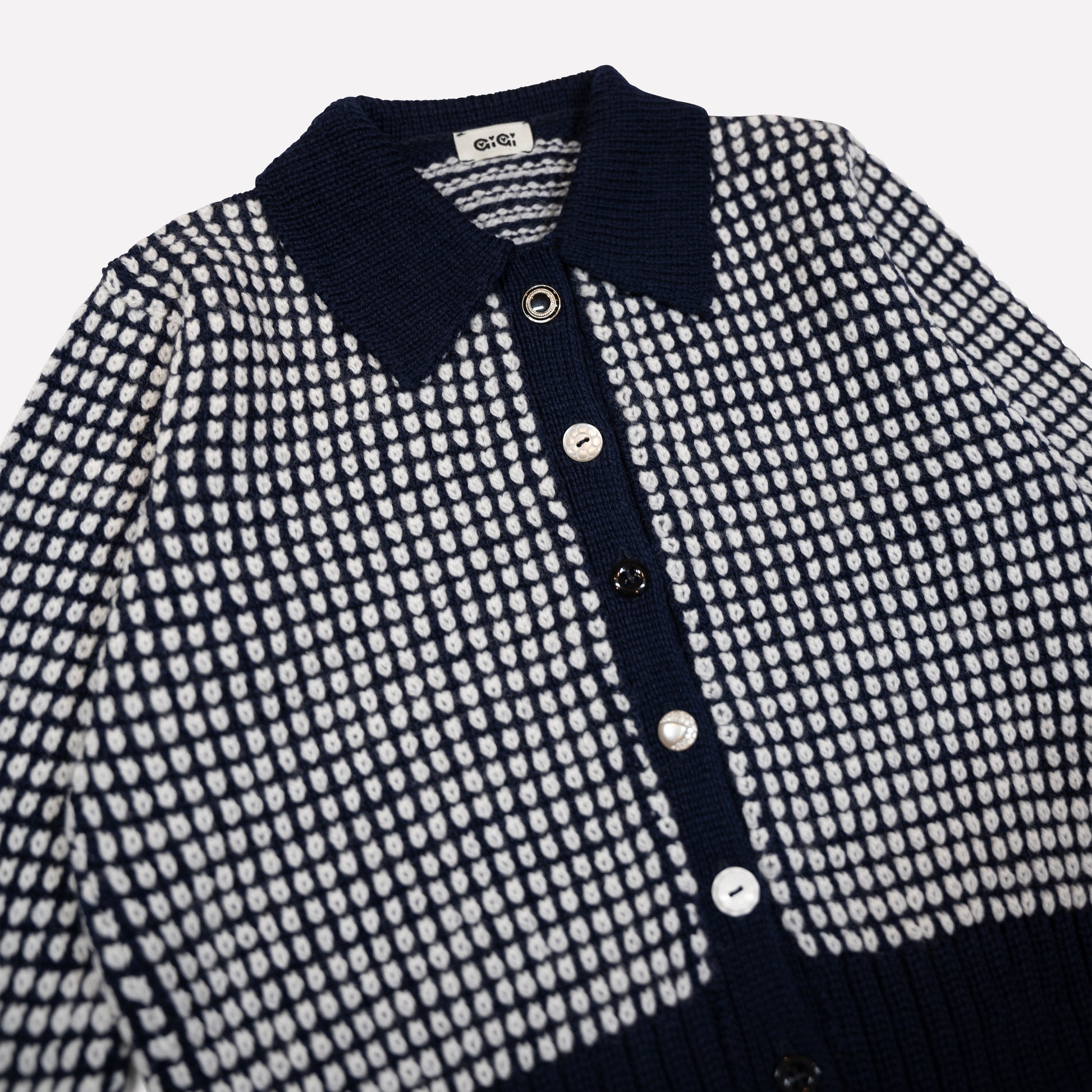 Our petite version of Mismatch Cardigan is in 1970’s inspired classic navy and ivory stripes stitch. Adorned with fun mismatched vintage buttons.