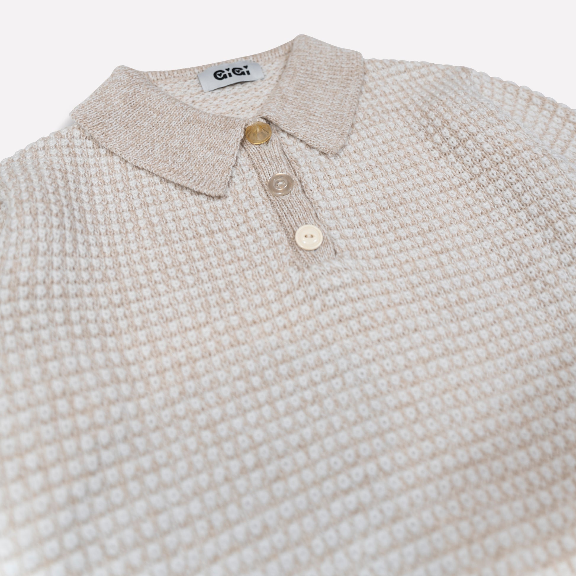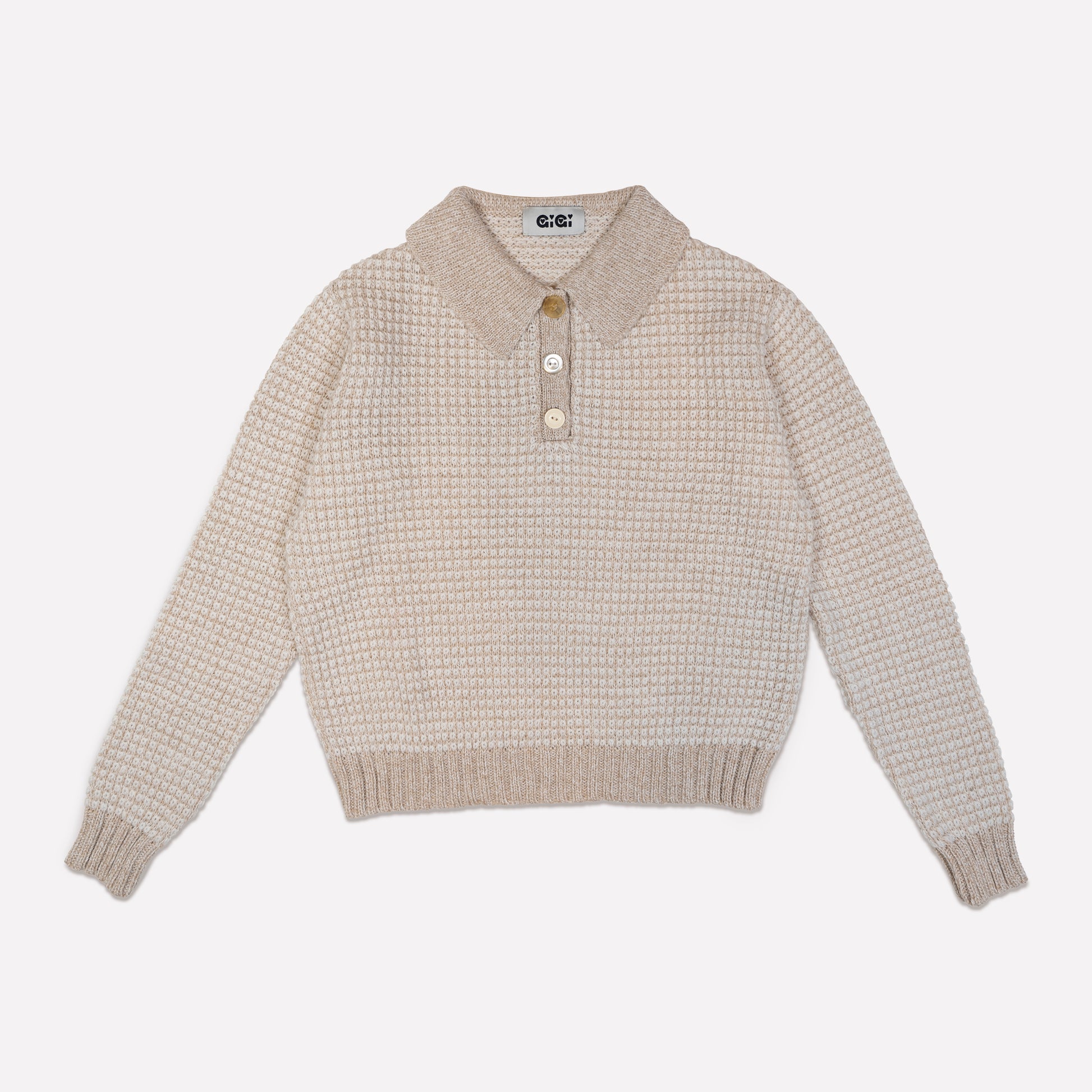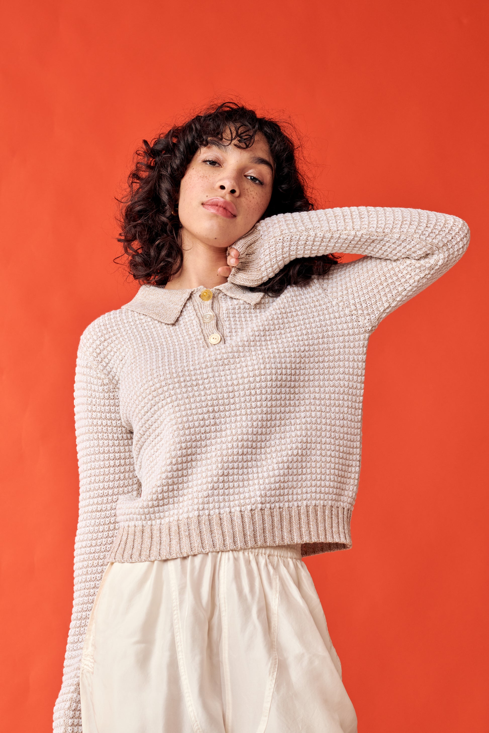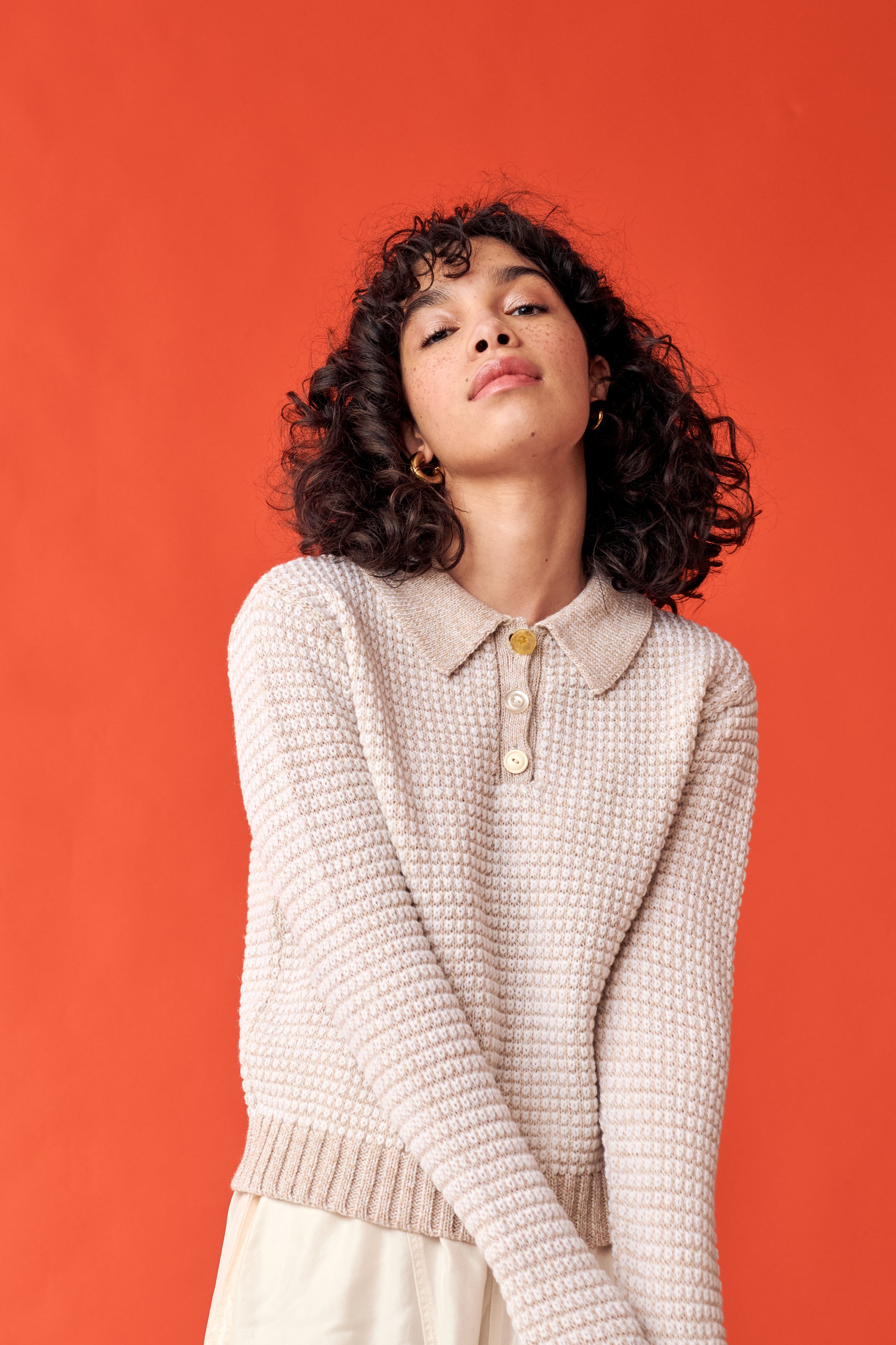 Our newest Mismatch Polo Sweater hits the sweet spot between slouchy and slim with an easy fit, perfect to layer over when there is a chill in the air or wear solo. Rendered in soft merino wool, we loved this 1970’s inspired shape and wanted to add our Gigi touch to it. Playing with trompe l'oeil, shades of beige marl and ivory are seamlessly knit together to create the visual effect of stripes. We finished the knit placket with a triple set of vintage buttons, completing your new fall favorite with a wink.