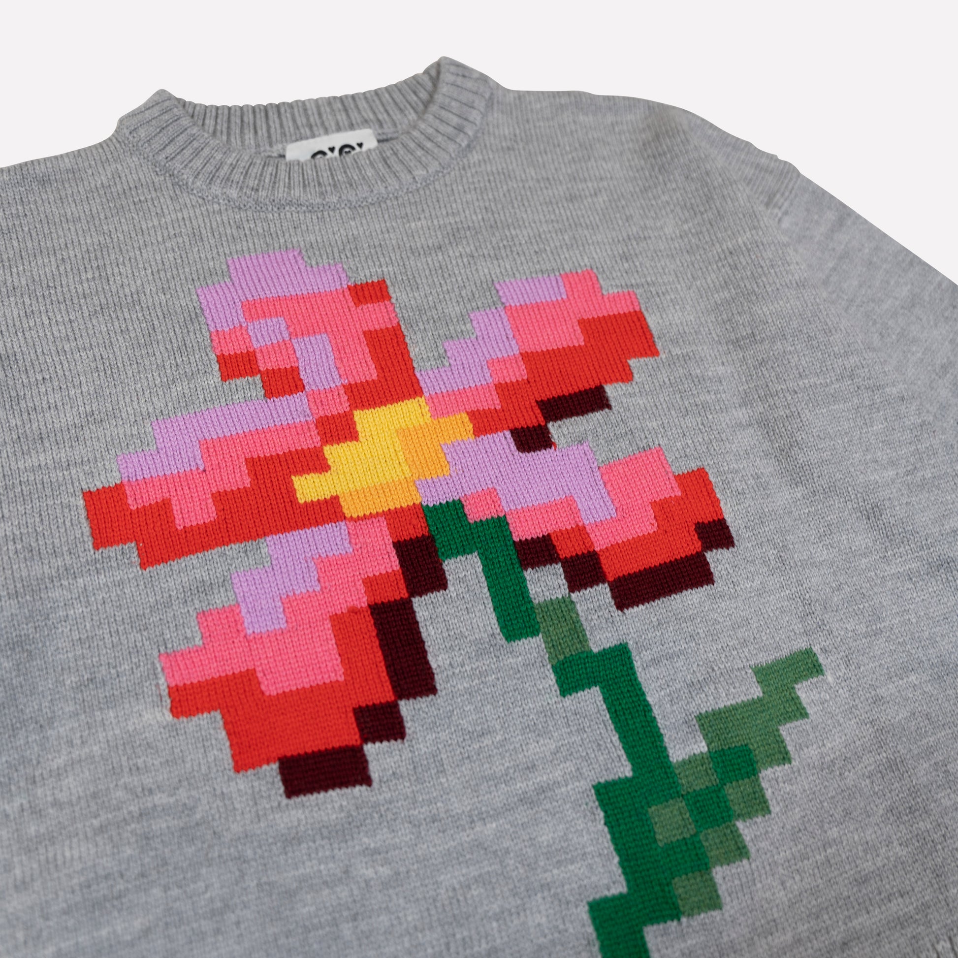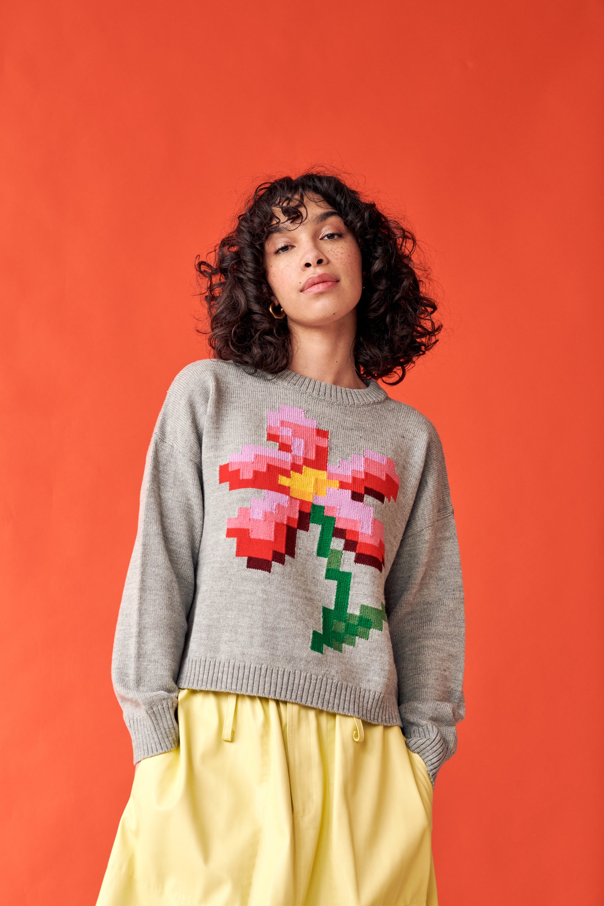 Cue our newest Pixel Flower Sweater. With an upbeat multicolored daisy pattern knitted into every piece, this sweater remixes our craft-inclined floral adornments with a technique that toys with the illusion of digital prints. Created with a grey fine Merino wool, this silhouette is relaxed, offering an update on our classic drop shoulder shape with a slightly boxy fit, and rest assured it will keep you going until the sun shines bright again.
