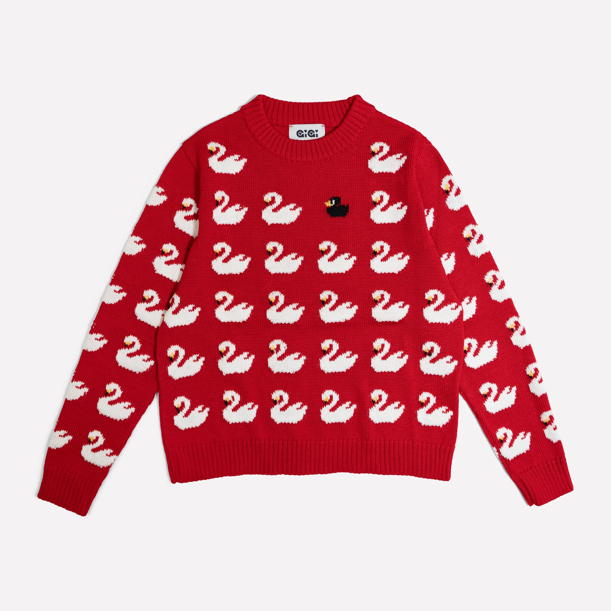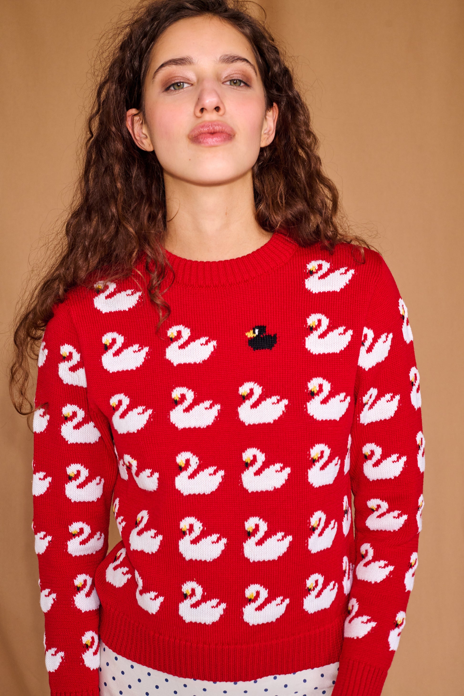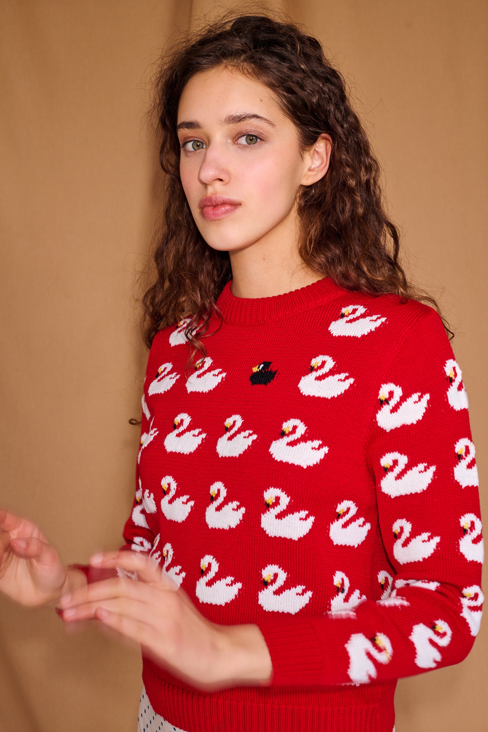 A Fairy Tale with a twist - this fitted red sweater is made from super-soft fine merino wool and features a sweet lineup of white jacquard swans — plus one little rebel, a black “ugly duckling” that steals the spotlight. With its slim, flattering silhouette, this piece is both playful and easy to wear.