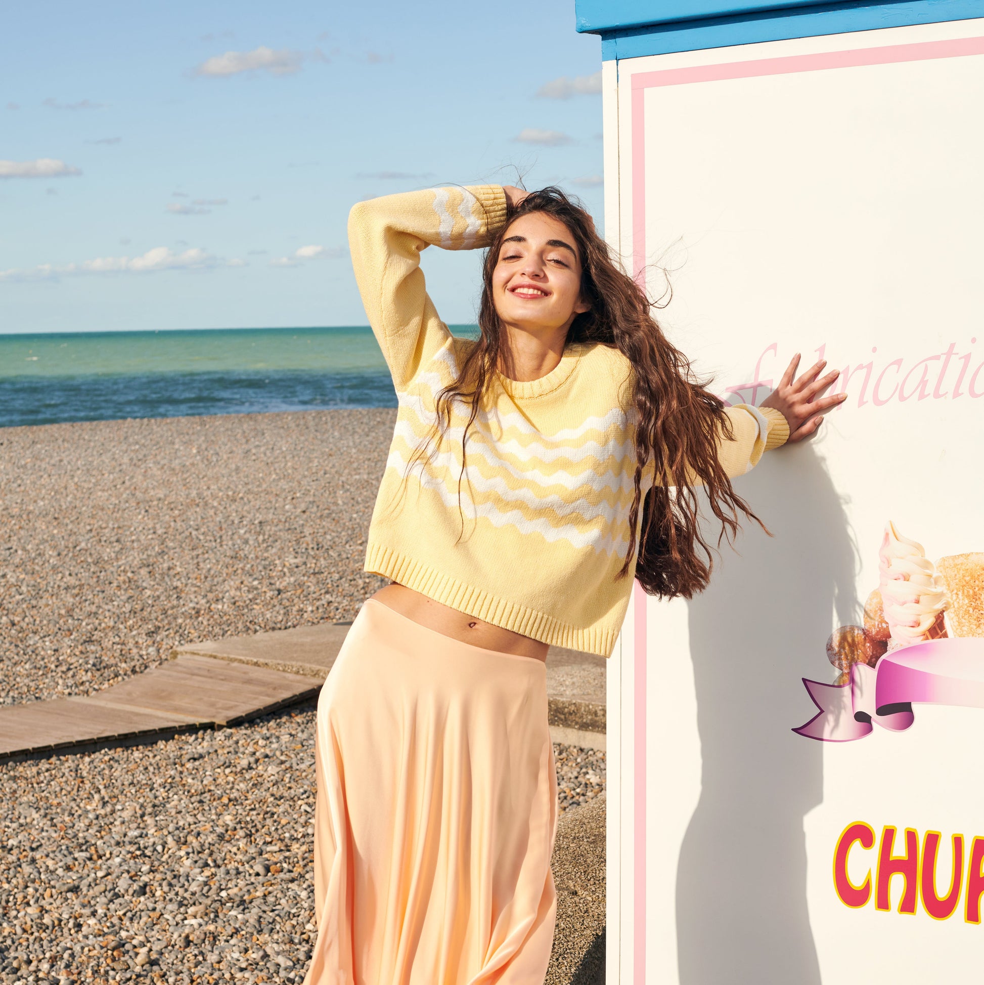 Soft, sunny, and effortless. Our Wavy Stripe Cotton Sweater in light yellow features delicate white wavy stripes on an easy, boxy silhouette. Crafted from 100% organic cotton in a medium-weight knit, it’s the perfect subtle statement for warm days and cool nights.